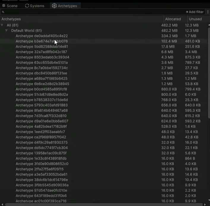 - ECS, 유니티 DOTS의 가장 중요한 정보로서 데이터 그룹을 결정하는 아키타입들의 목록을 확인하고 자세하게 분석할 수 있는 창