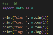 모듈을 가져올 때 이름 충돌이 발생하는 경우가 있을 수 있습니다, 또는 모듈이름이 너무 길어 짧게 줄여 사용하고 싶을 때 as 구문을 사용합니다.