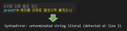 구문 오류는 프로그램의 문법적인 오류로 프로그램이 실행조차 되지 않게 만드는 오류이고, 예외는 프로그램 실행중에 발생하는 오류입니다.