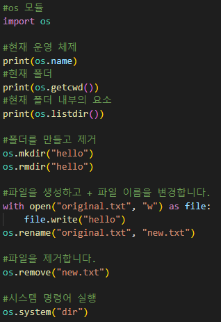 운영체제와 관련된 기능을 가진 모듈입니다. 새로운 폴더를 만들거나 폴더 내부의 파일 목록을 보는 일도 모두 가능합니다.