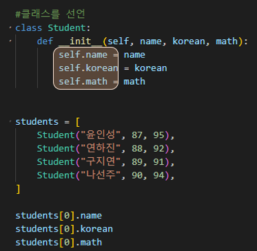 self는 '자기 자신'을 나타내는 딕셔너리라고 생각하면 되며 속성과 기능에 접근할 때는 self.<식별자> 형태로 접근합니다.