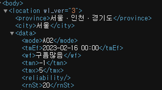 기상청의 XML 파일을 확인해보면 location 태그와 city, wf, tmn, tmx 태그를 찾아볼 수 있습니다.
