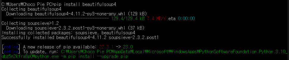 예를 들어 아래의 이미지와 같이 Beautiful Soup라는 모듈을 설치한다면 다음과 같이 입력하면됩니다.